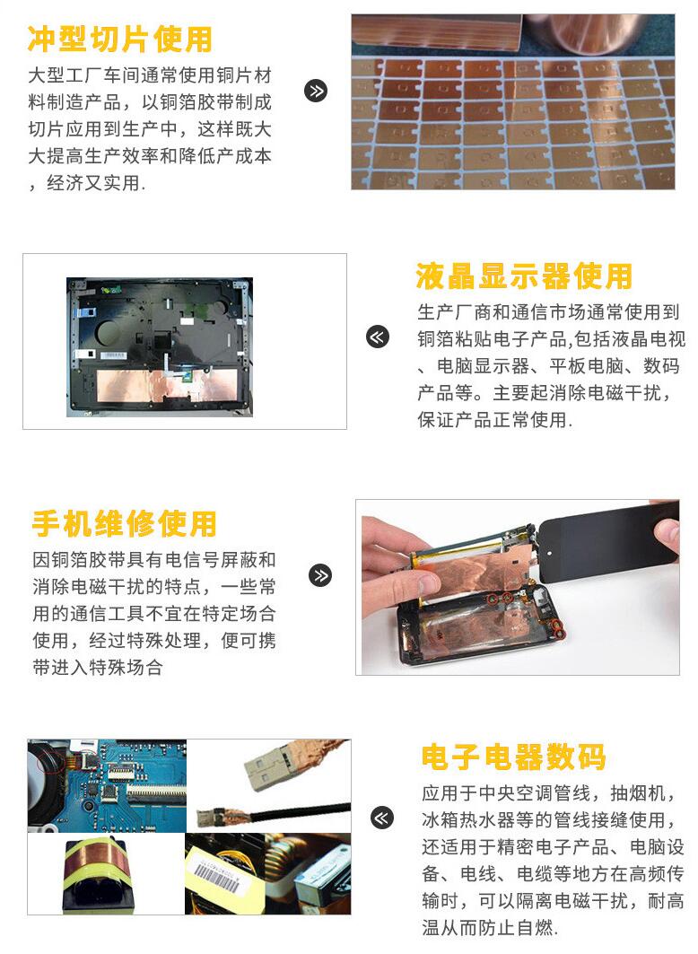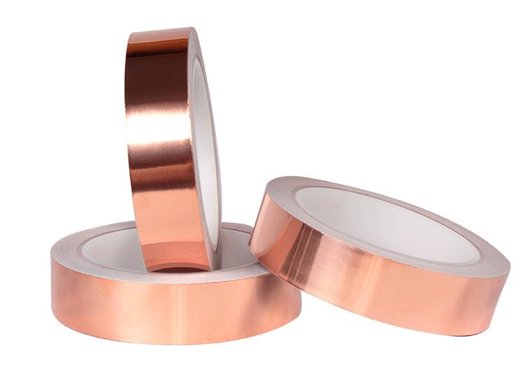 銅箔具有低表面氧氣特性,可以附著于各種不同基材,如金屬,絕緣材料等,擁有較寬的溫度使用范圍。主要應(yīng)用于電磁屏蔽及抗靜電,將導(dǎo)電銅箔置于襯底面,結(jié)合金屬基材,具有優(yōu)良的導(dǎo)通性,并提供電磁屏蔽的效果??煞譃?自粘銅箔、雙導(dǎo)銅箔、單導(dǎo)銅箔、雙面雙導(dǎo)銅箔。雙導(dǎo)銅箔膠帶是一種一面涂亞克力導(dǎo)電膠,而且另一面銅本色也是導(dǎo)電的金屬膠帶。