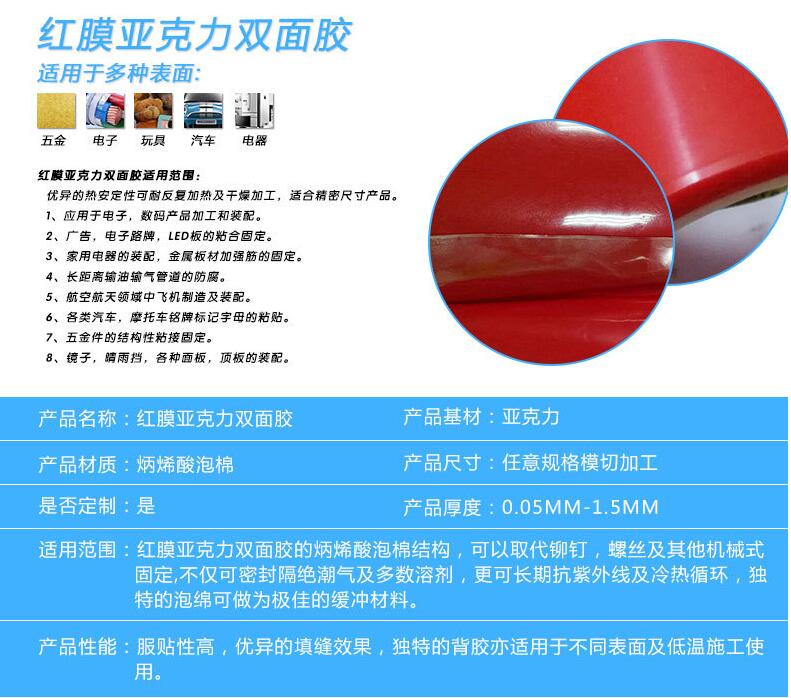 防潮,抗溶劑性,高低溫循環(huán)周期性且吸震力高。壓克力膠帶可有效減輕重量,取代螺絲、鉚釘、焊接,同時(shí)固定及密封。具有極佳的填縫效果,隔絕濕氣、灰塵、及化學(xué)物質(zhì);耐久性、耐候性優(yōu)異;抗震抗老化、抗UV抗溶劑、降低噪音。超強(qiáng)的粘性,不論是塑膠表面、金屬表面、玻璃表面、凹凸不平的壁面都能起到粘接牢固的效果。